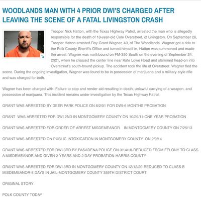 6. Grant was arrested for DWI (4th) in Montgomery County on 12/12/2020 - reduced to Class B misdemeanor and received 8 days in jail - Montgomery County 359th District Court